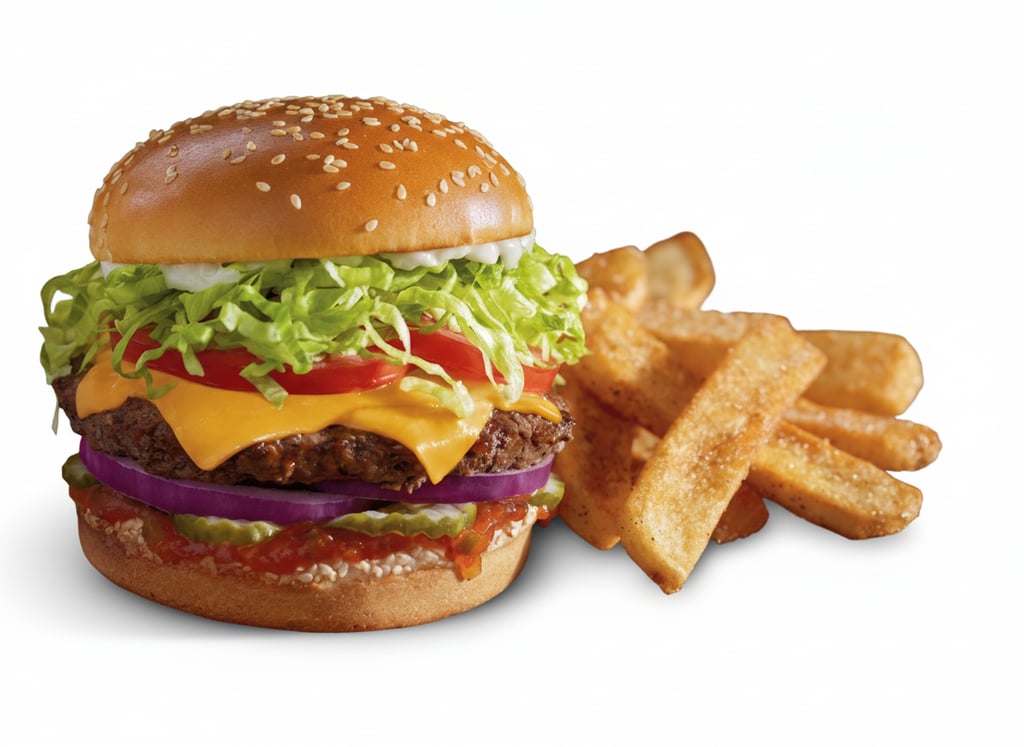 لحم بقري، جبن شيدر، خس، طماطم، صلصة منزلية، مخلل، خبز بريوش، بطاطا مقلية