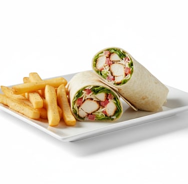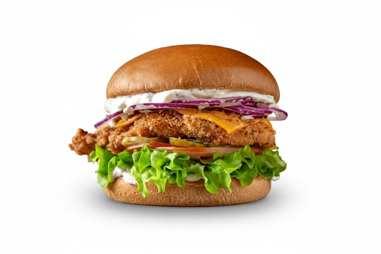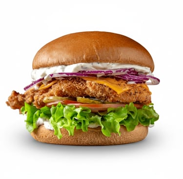 CHICKEN PATTY, LETTUCE COLESLAW, CHEDDAR SLICES, SRIRACHAMAYO, AND BRIOCHE BUN WITH FRIES