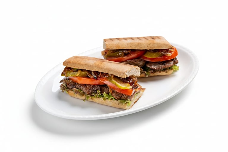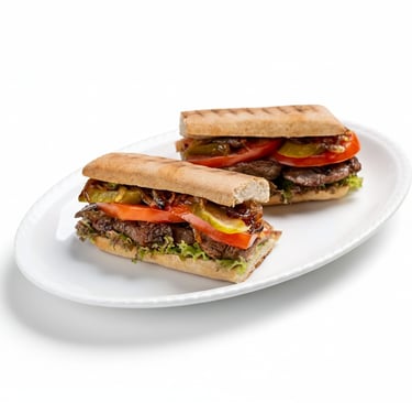ريب أي ستيك، مايونيز، جبن، جبن شيدر مذاب، بصل، مكرمل، خبز، تشا بانا، بطاطا مقلية
