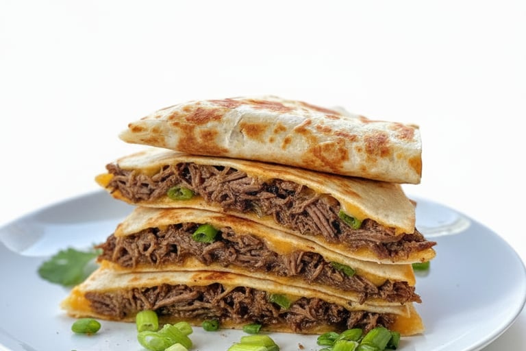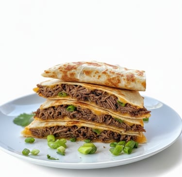 مكعبات لحم، جبن مونتيري جاك وشيدر، فلفل، زيتون اسود، خبز تورتيلا