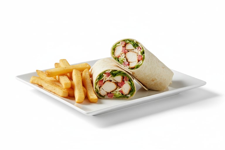 صدر دجاج مشوي، بيض مسلوق، خس، طماطم، أفوكادو، صوص سيزر، بطاطا مقلية