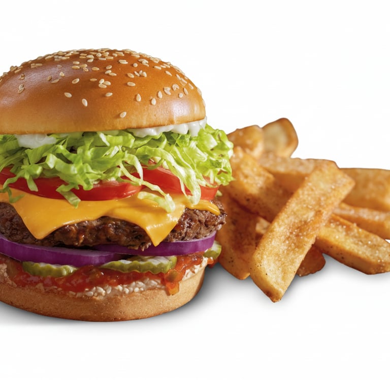 BEEF PATTY, CHEDDAR CHEESE, LETTUCE, TOMATO, HOUSE DRESSING, PICKLED CUCUMBER,BRIOCHE BUN AND FRENCH FRIES
