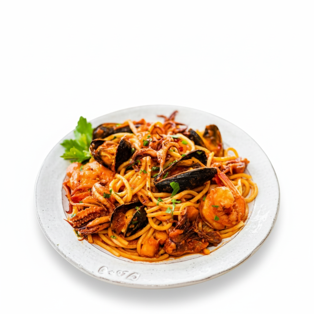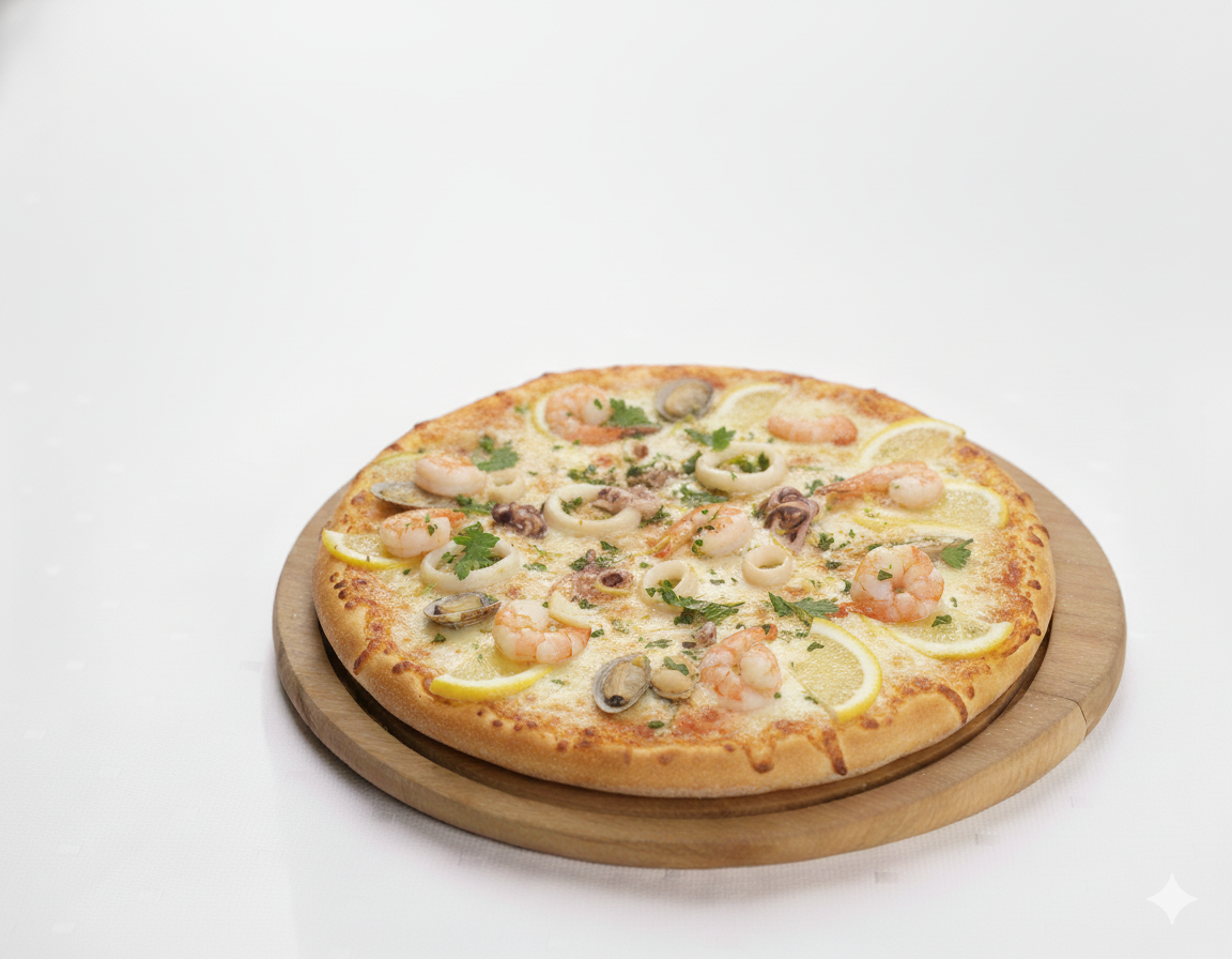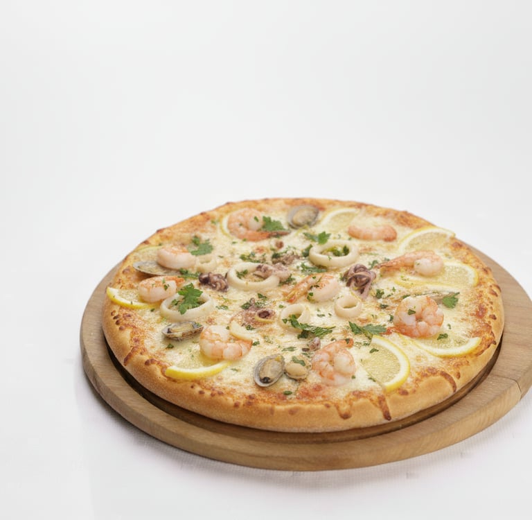 SQUID TUBE, SHRIMPS, TOMATO SAUCE ,ONION OREGANO & BASIL LEAF