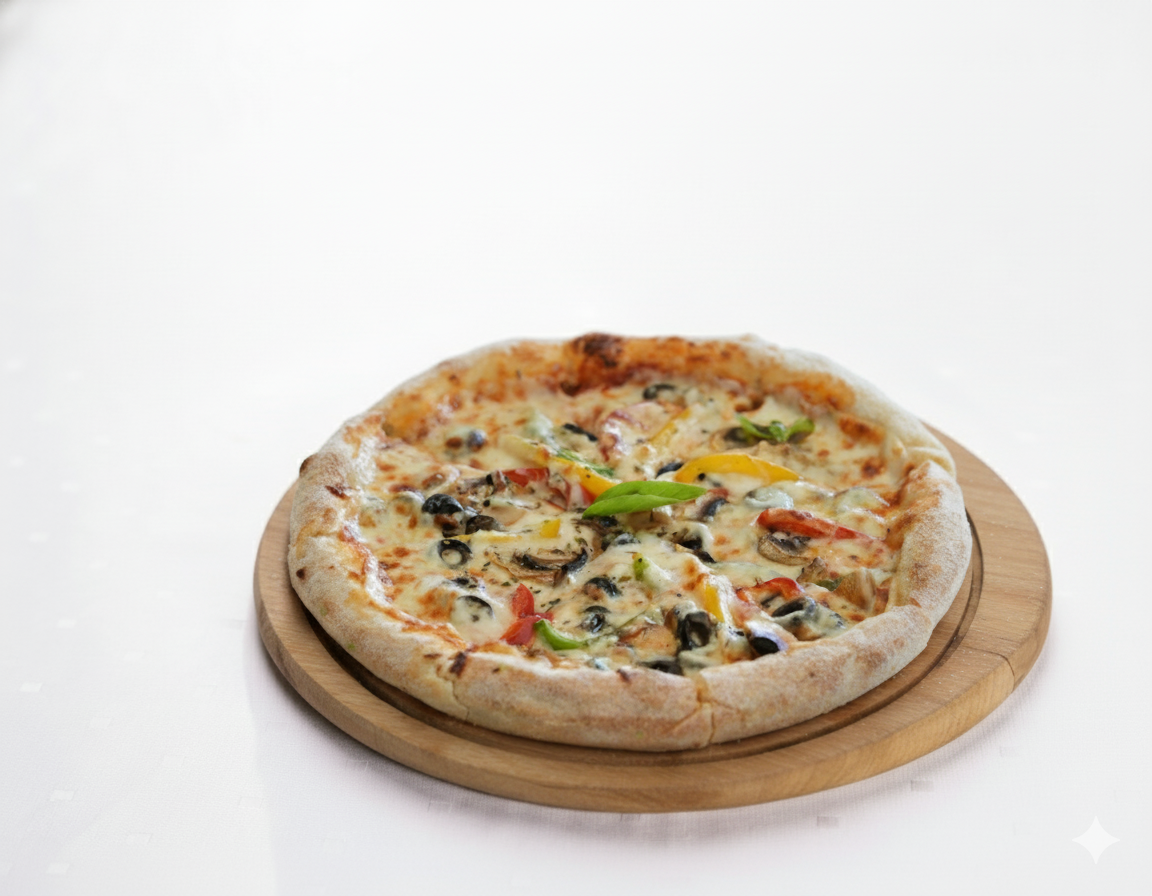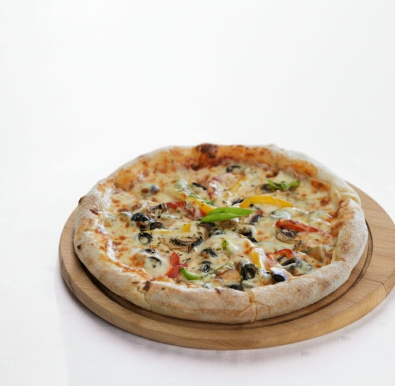 ZARELLA CHEESE, TOMATO SAUCE, BLACK OLIVE,BROCCOLI, GREEN PEPPERS, OREGANO & BASIL LEAF