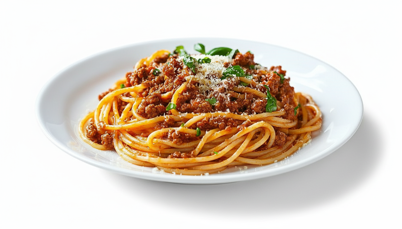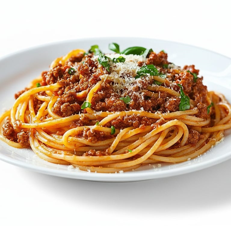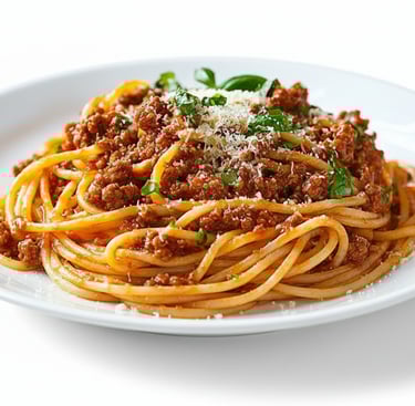 SPAGHETTI PASTA, HOME MADE BOLOGNESE SAUCE, BASIL, PARSLEY AND PARMESAN CHEESE