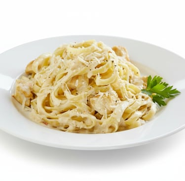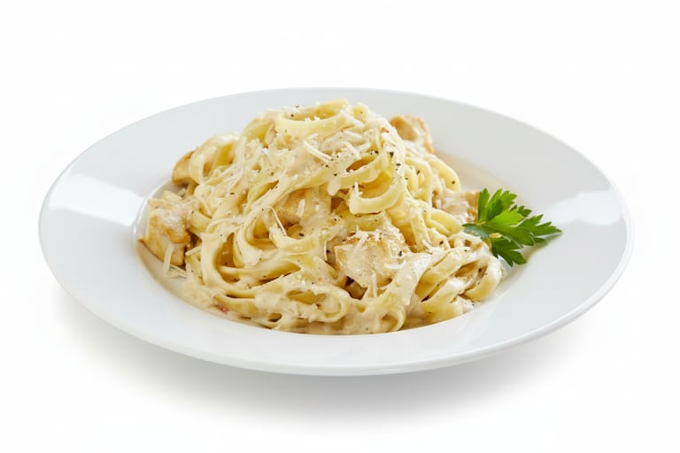 PENNE PASTA, CHICKEN, PARMESAN CHEESE, COOKING CREAM AND CHOPPED PARSLEY